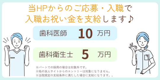 直接応募で採用された方に限り、当院の規定に基づき就職祝金を進呈いたします。