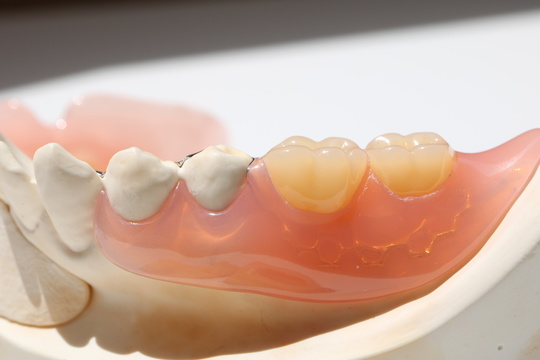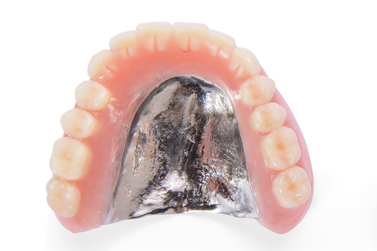 入れ歯の土台となる床(歯ぐきに接する部分)が金属でできた入れ歯です。金属を使用しているため、耐久性に優れ、入れ歯を薄く作れます。