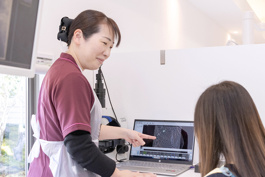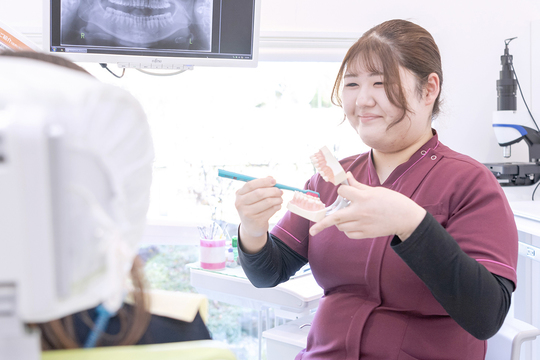歯周病治療の過程では、複数回にわたって歯石・プラークの除去を実施。また、ご家庭での歯磨き方法の指導もいたします。私どもはこれらの診療の際に、患者さまごとにそれぞれ担当の衛生士をおつけします。同じ歯科衛生士が継続して同じ患者さまを担当するため、お口の中の変化にも気づきやすく、よりきめ細やかなケアを行えるのです。